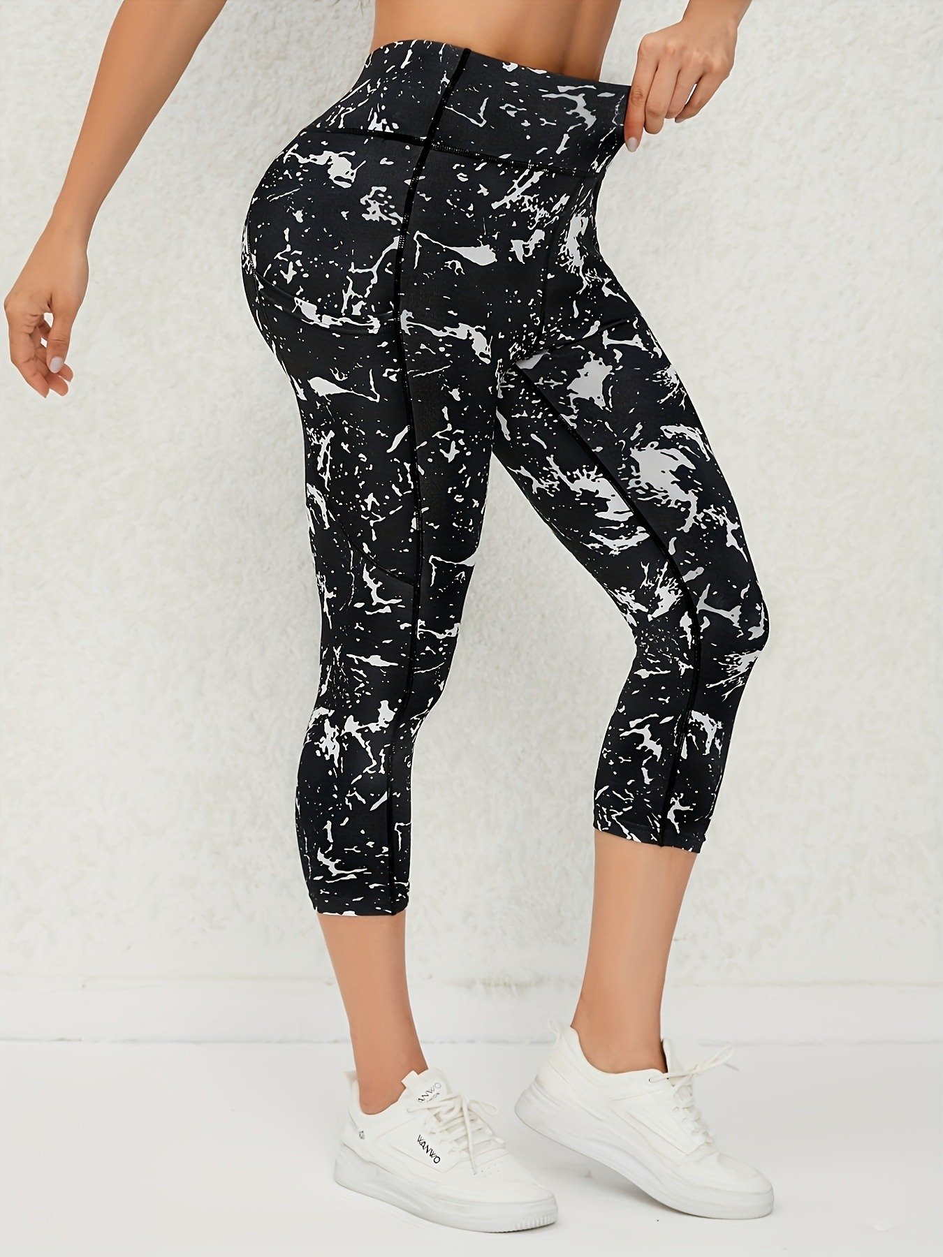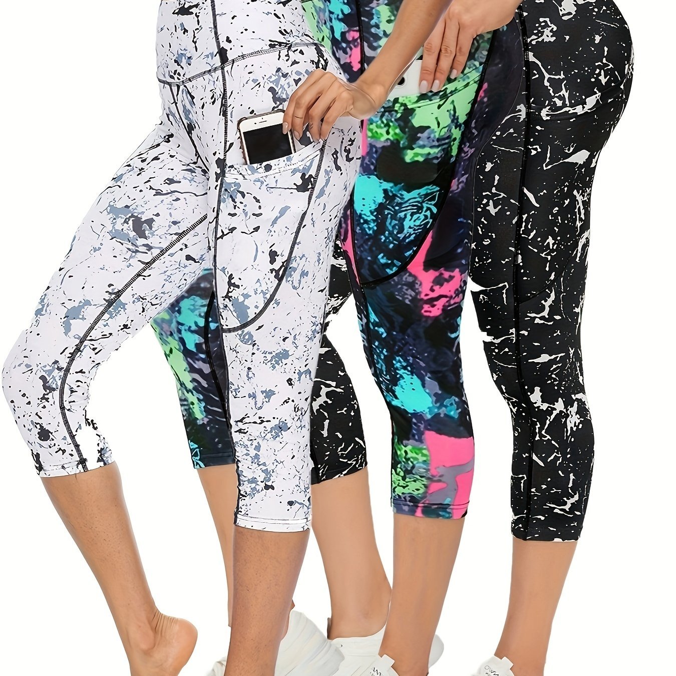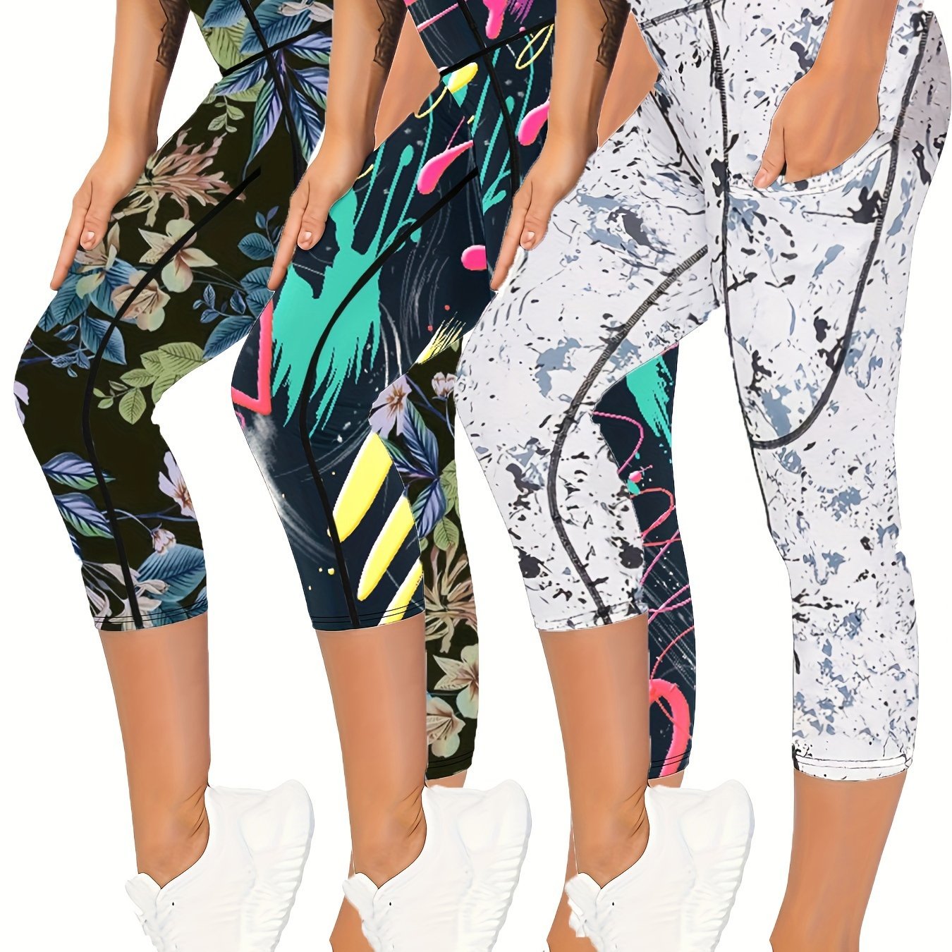 3pcs High Elastic Print Running Workout Capri Leggings With Pocket, Women’s Slim Fitness Yoga Pants, Activewear
