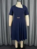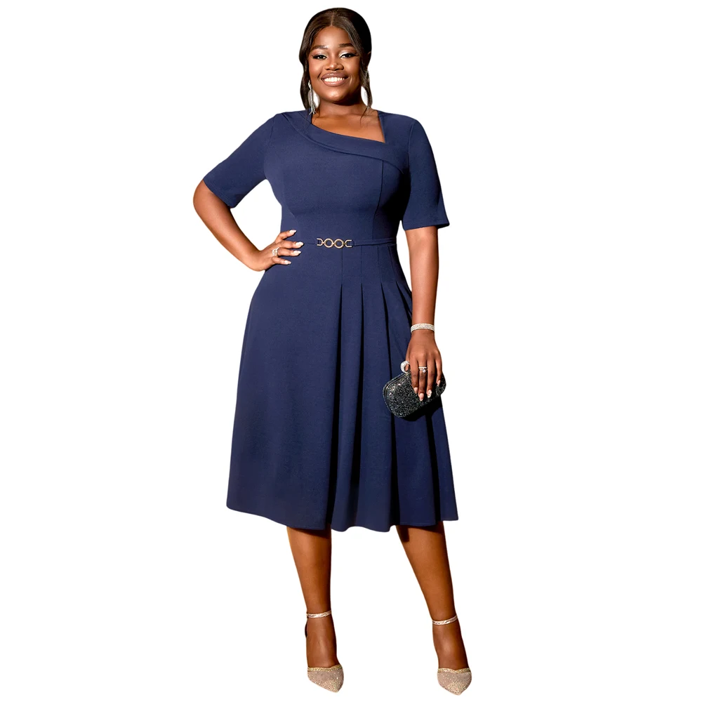 Product Name: Asymmetry Neck Short Sleeves Navy a Line Pleated Casual Plus Size Women Dress with Belt