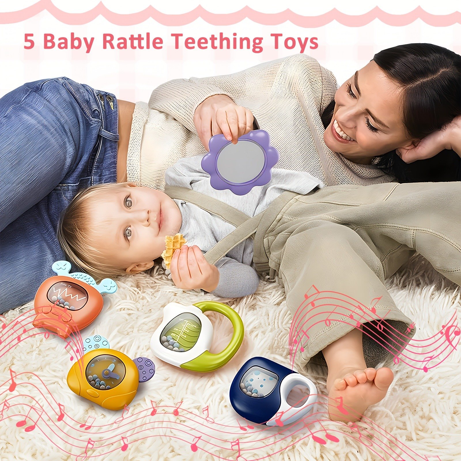 [5 In 1 All-Round Development]4 Removable sensory toys and 1 flower mirror, fully meet the baby’s growth needs. 4 Toys: Baby teapot rattle, water cup rattles for newborn baby touching-growing,and TV rattle,clock rattle for improve baby responsiveness.Piano keyboards touching for graphics,listening.All for colors cognitive. 1 flower mirror,as an important way for self-discovery.
