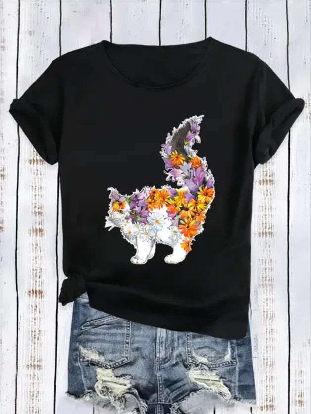 Casual Style, Short Sleeve, Floral Cat Print Cute Round Neck T-Shirt, Sports Top For Women