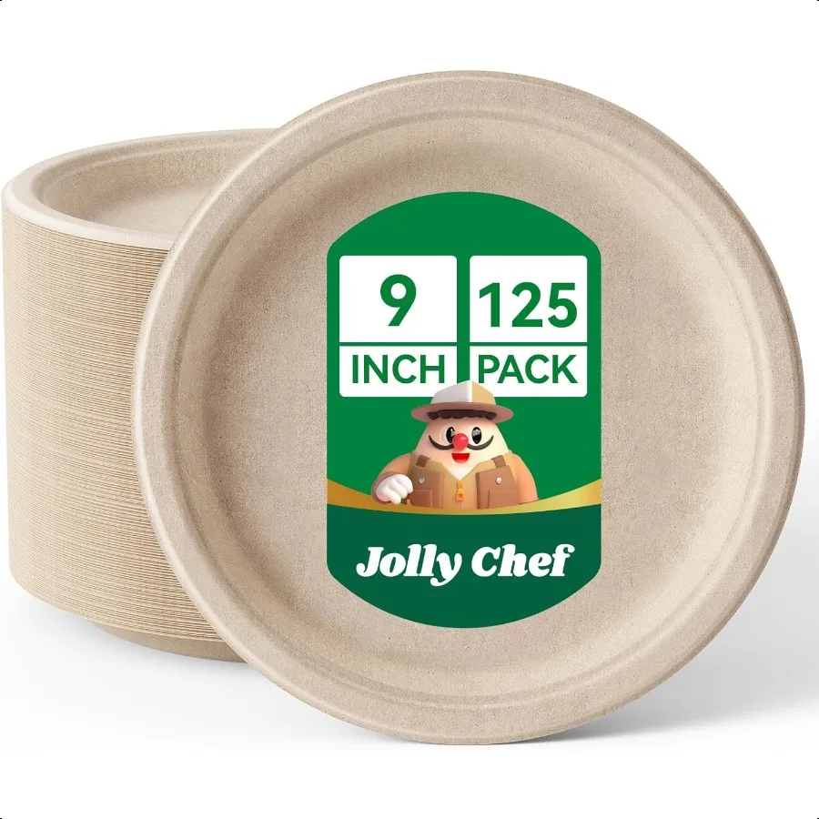 Compostable Heavy Duty Plates 9 Inch [125 Pack] EcoFriendly Disposable Natural Paper Plates Bagasse Biodegradable Bulk for Part