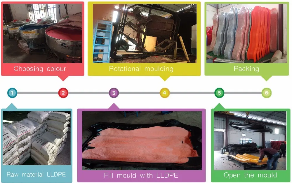 1. Plastic parts: Food grade LLDPE plastic formed by rotational molding, which is environmentally friendly, safe, colorful, UV resistant, with antistatic ability, cold resistant, high temperature resistant, and strong.