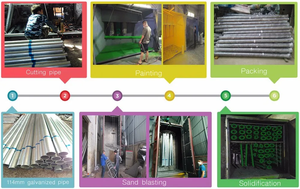 2. Column: Φ114mm galvanized pipe thickness of the pipe:2.0mm The surface is sprayed by paint, which is smooth, with strong UV resistance, colorful, corrosion resistance, and not easy to fall off.