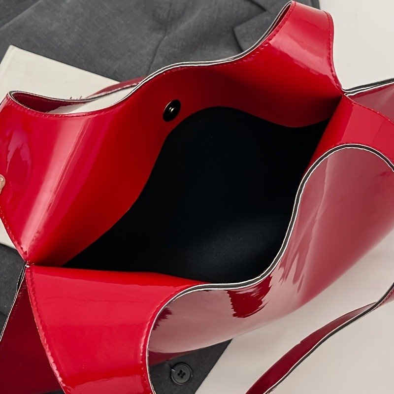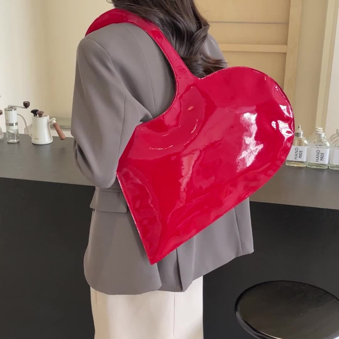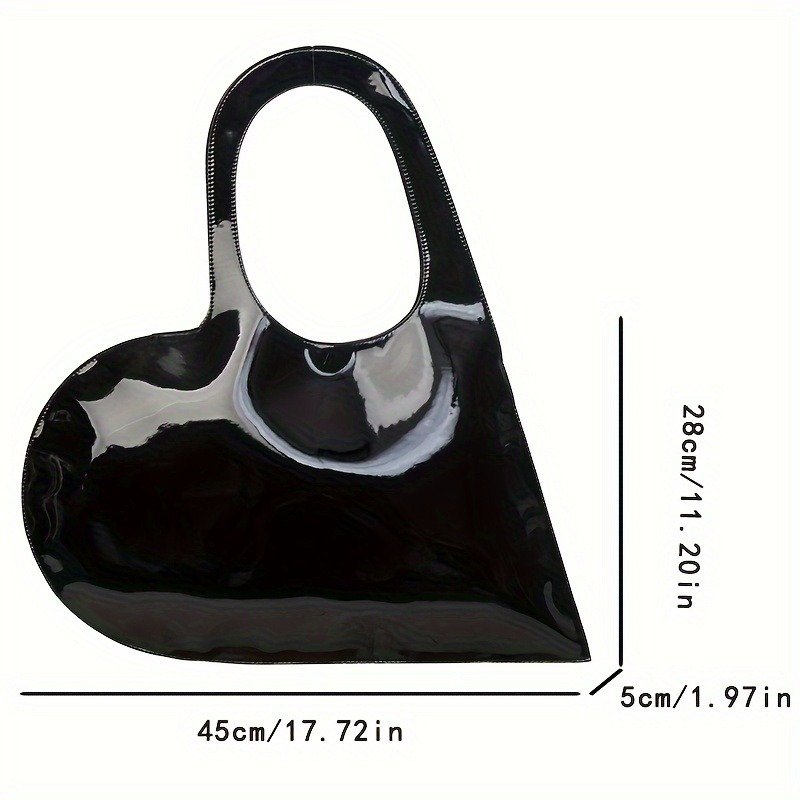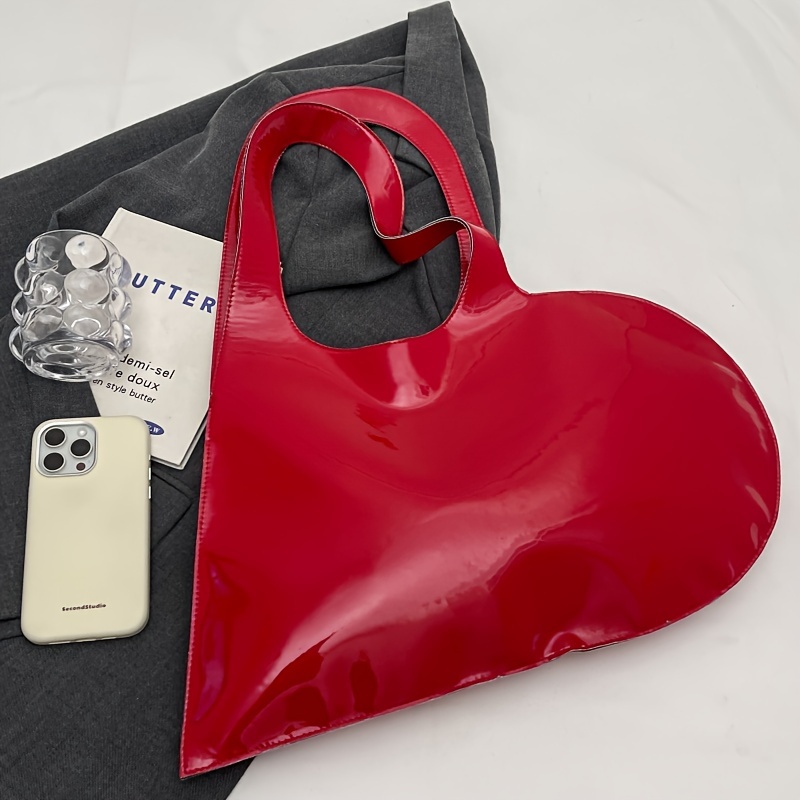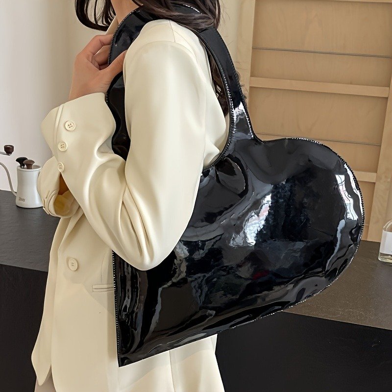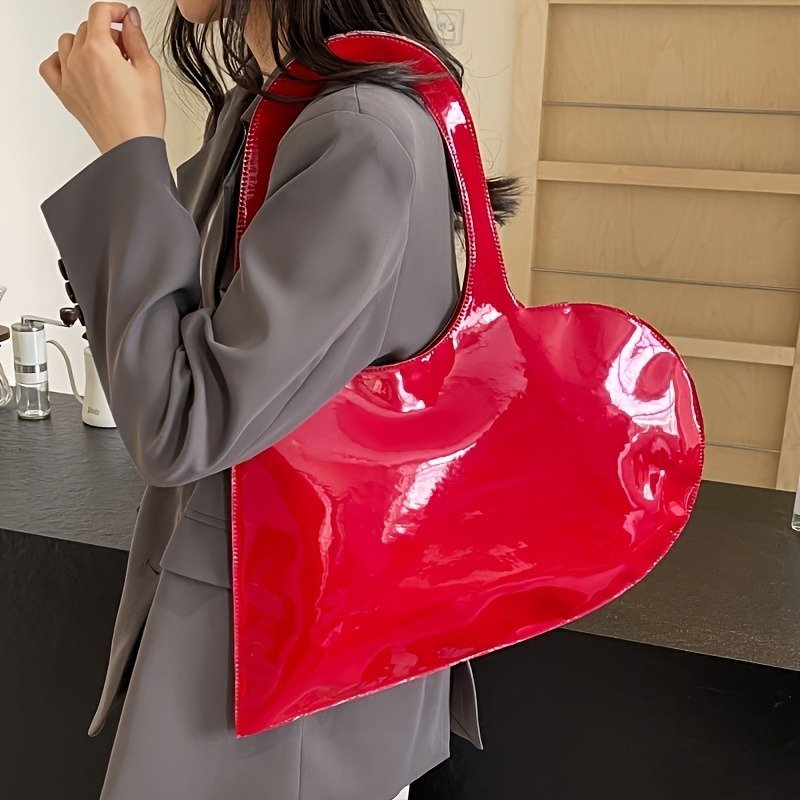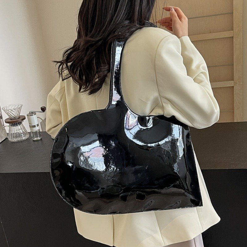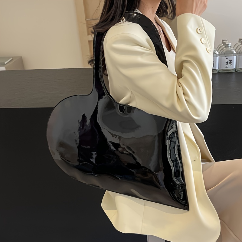 Fashionable Heart-Shaped Glossy PU Shoulder and Tote Bags for Women, Versatile for Travel, Shopping, and Everyday Use, Solid Color with Polyester Lining, Secure Buckle Closure