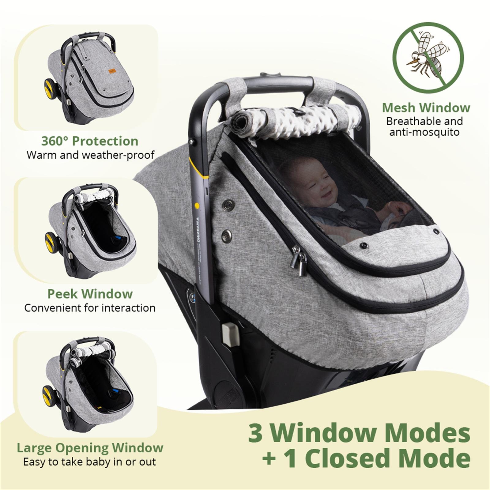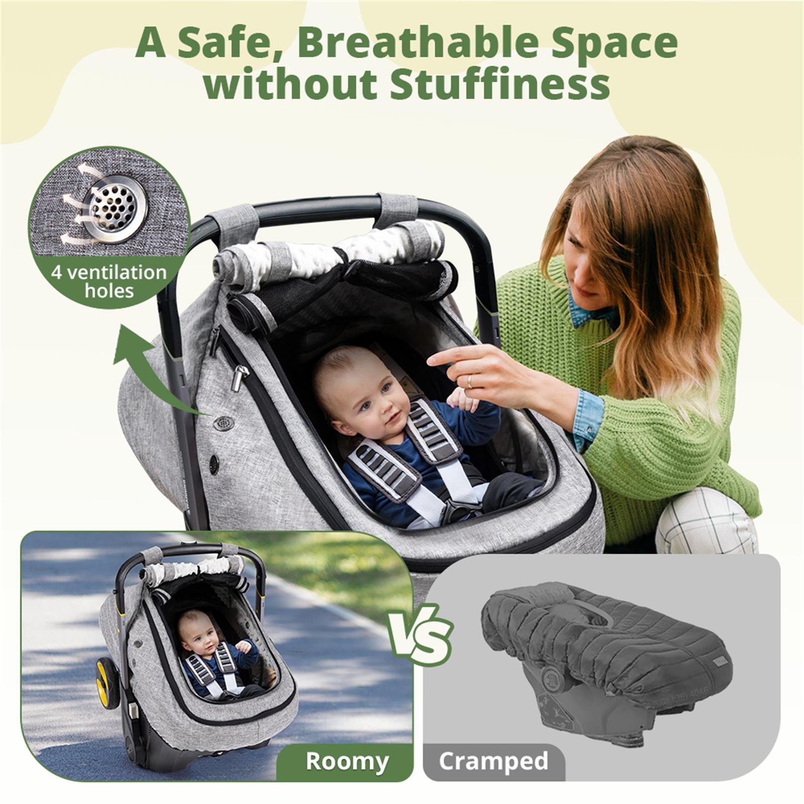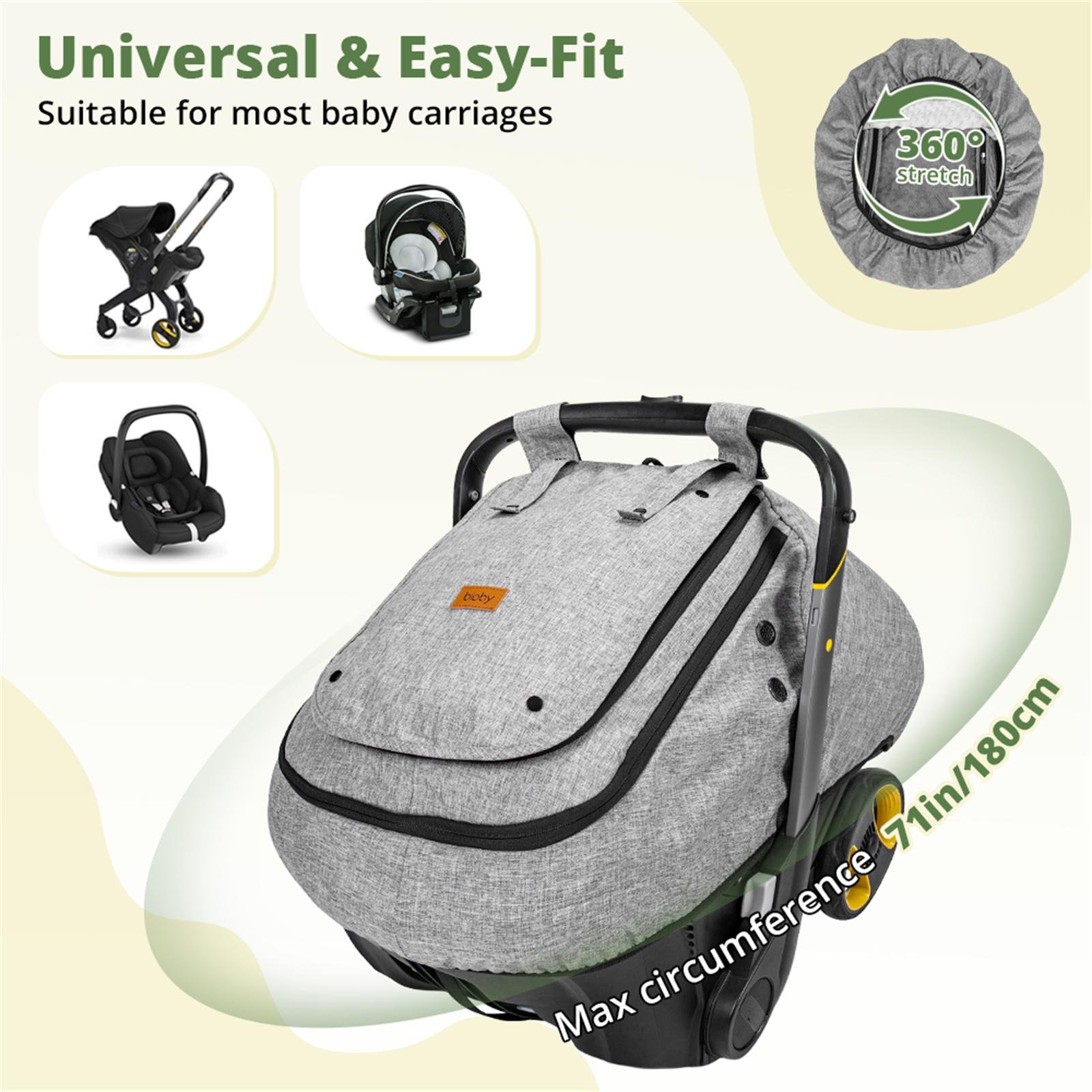Infant Car Seat Cover with Dual Vents: With four vents on either side, this car seat canopy allows for sufficient airflow for your child, even when all the windows are shut. This design guarantees a cozy resting area by keeping fresh air circulating around the baby.