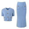Newest 2024 French Style Lady Solid Suit O-neck Short Sleeve Single-breasted Cardigan Long Skirt Women Flowers Button Knit 2Pcs