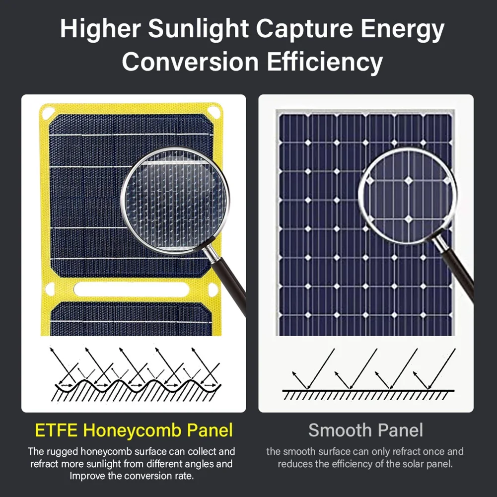 4. Waterproof for Outdoor Use: The photovoltaic panel features an ETFE epoxy resin surface lamination with self-cleaning properties and IP65 dust and water resistance, allowing it to operate normally in unexpected weather conditions and improving durability. It outlasts other PET panels and is more wear-resistant. Note: The connection area is not waterproof.