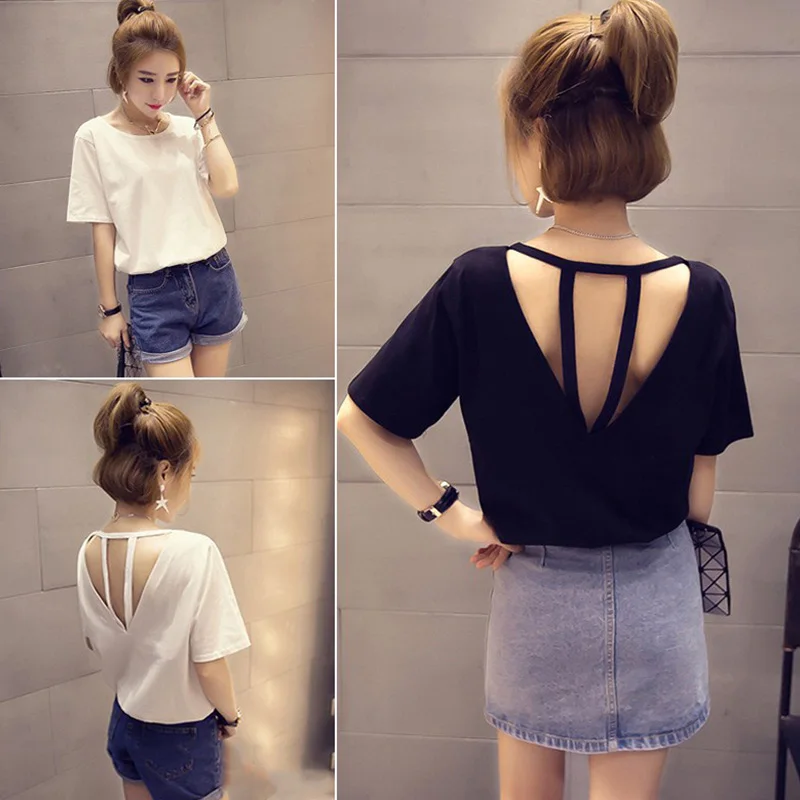 Sexy Backless Hollow Out T-shirt Tops Women Summer Short Sleeve Solid Color Loose T Shirt Casual Plus Size Tee Shirt Femme