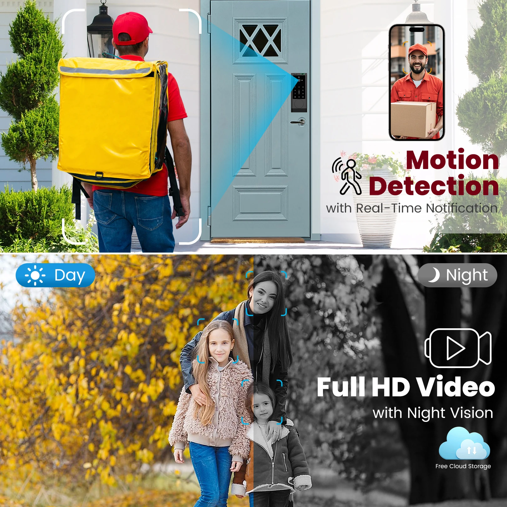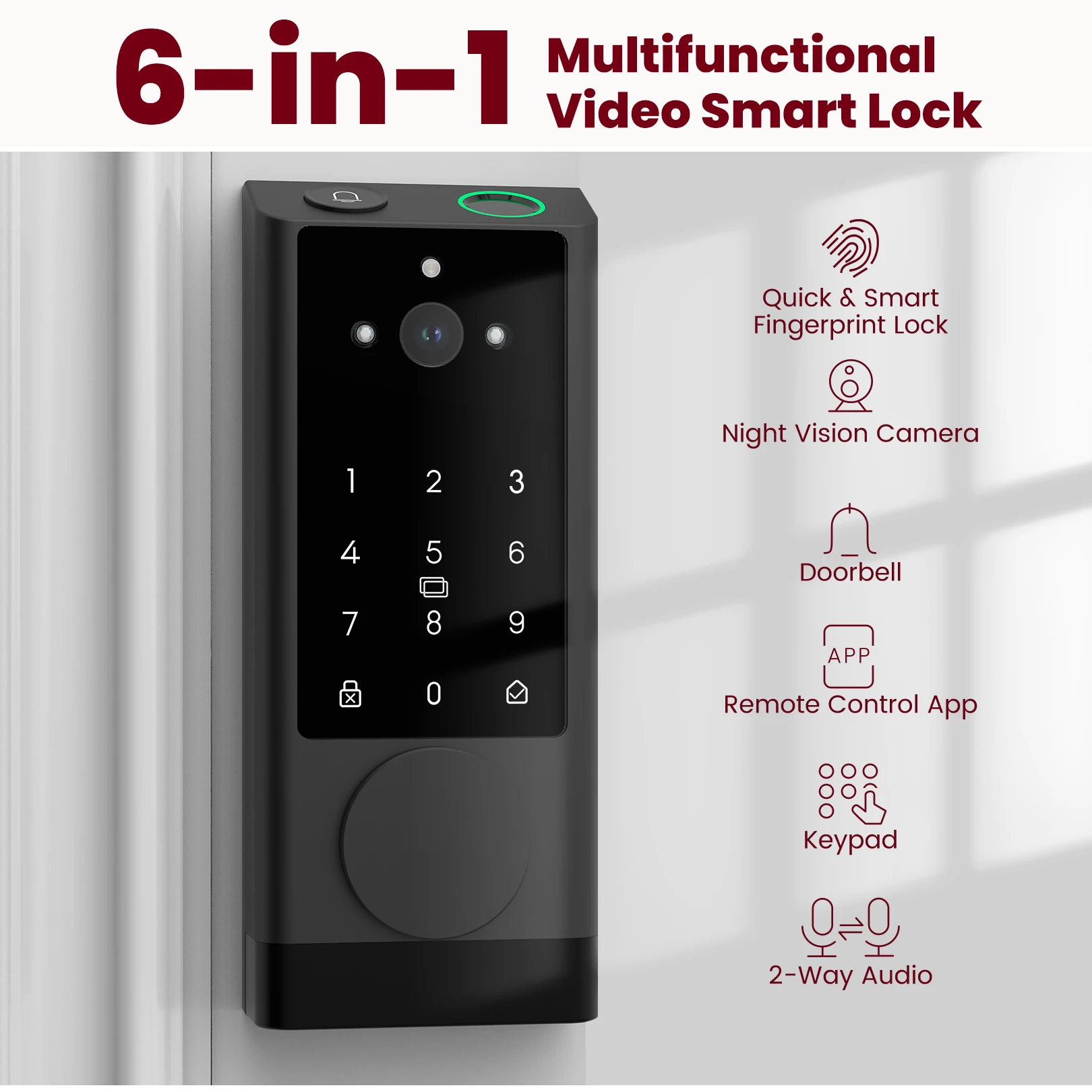 [Multi-Function Integration]The vedio smart lock integrates HD camera, doorbell and fingerprint door lock. The built-in HD camera allows you to clearly capture the real-time images and situations of users at the door. The two-way intercom function and night vision function allow you to communicate with visitors outside the door without obstacles anytime and anywhere.