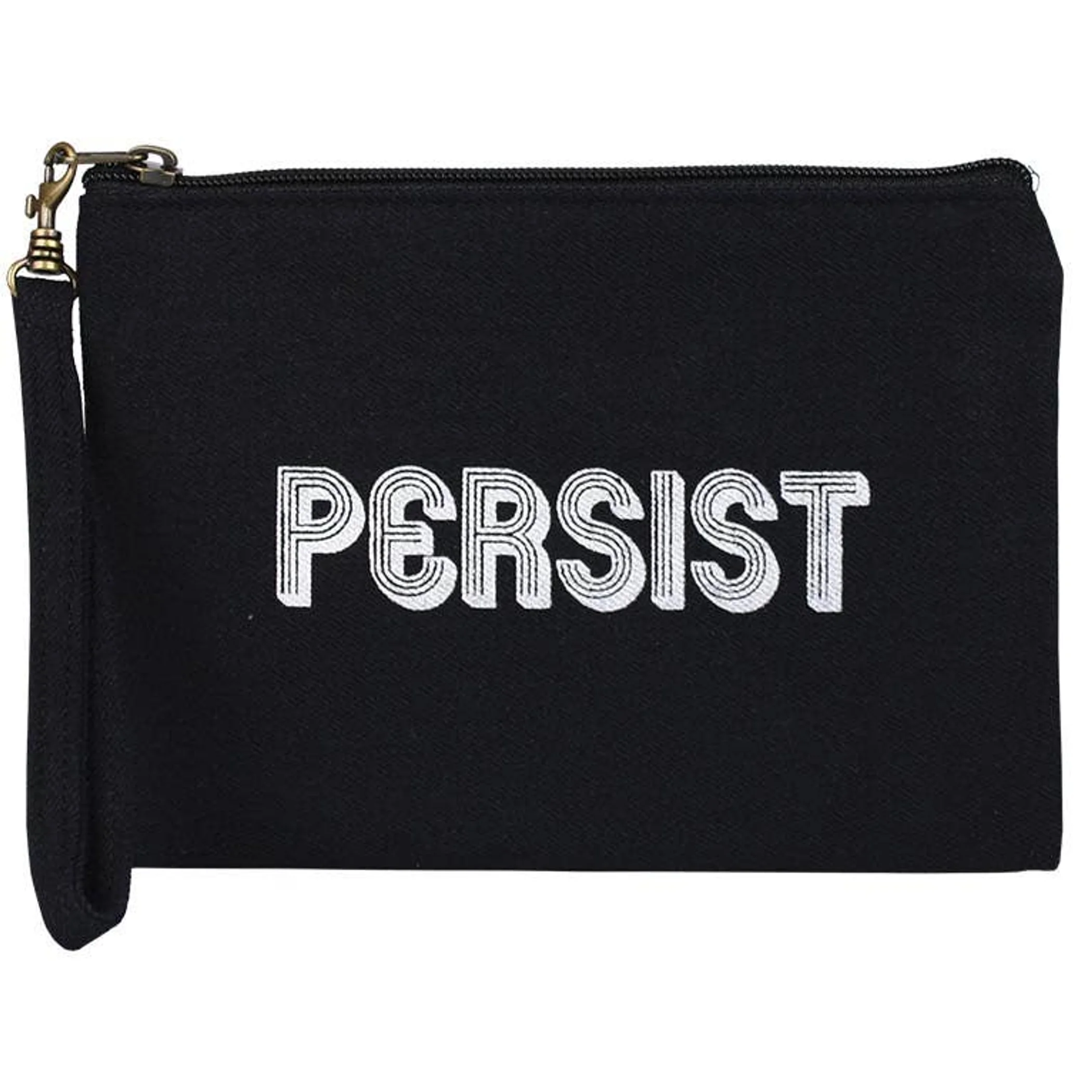 This wristlet features a bold “PERSIST” embroidery in white against a black background, symbolizing strength and determination. It includes a secure zipper closure and a detachable wrist strap for added convenience. The compact design ensures easy portability while providing ample space for essentials.