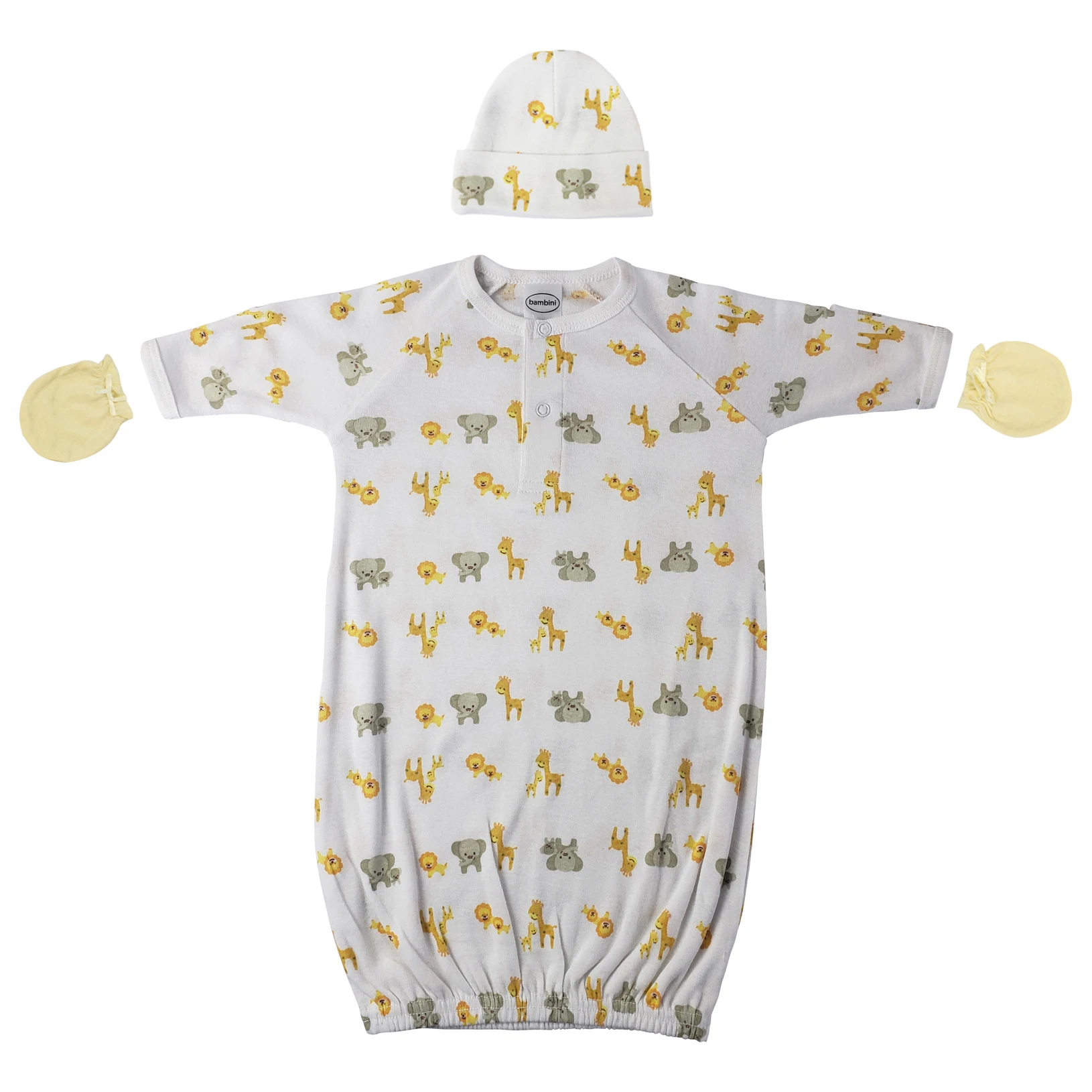 Preemie Infant Gown (100% Cotton), Yellow Infant Mittens (Jersey), Printed Baby Cap (100% Cotton)