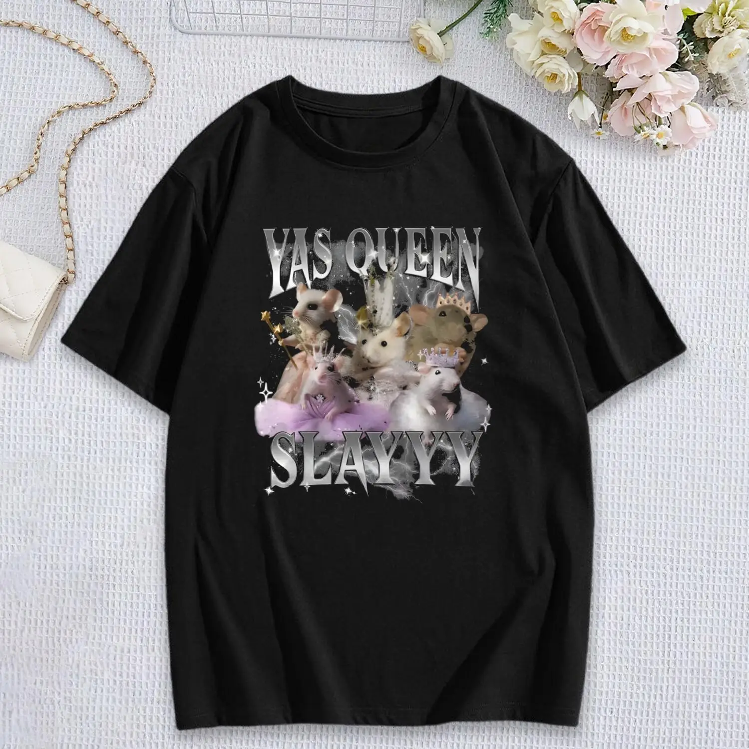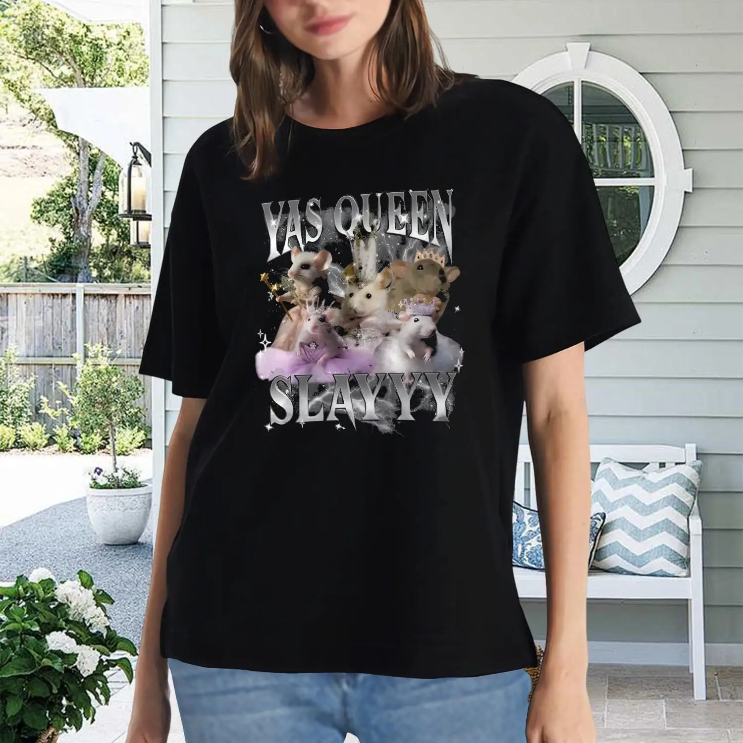 Women’s Graphic T-Shirt, Yass Queen Slayyy Rats Tee, Short Sleeve Cotton Top for Women & Teens