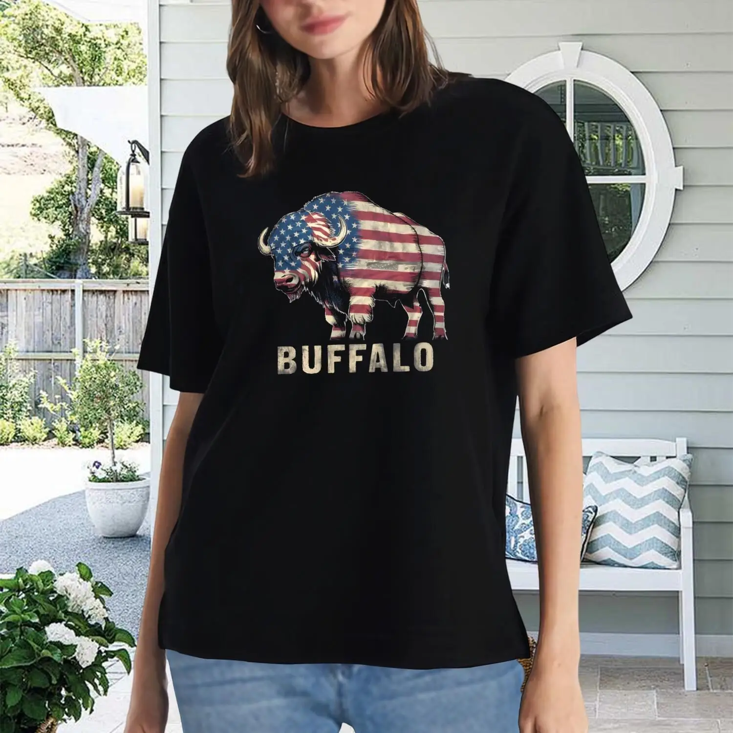 Women’s Patriotic Buffalo T-Shirt, American Flag Bison Tee, Short Sleeve Graphic Top for Women, Casual Summer Gift