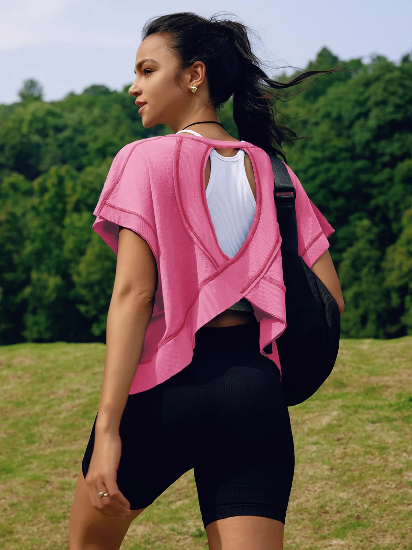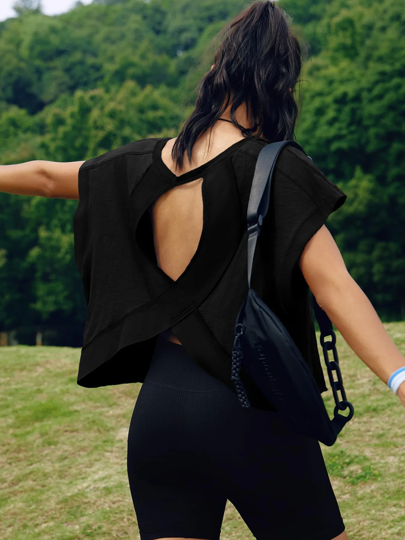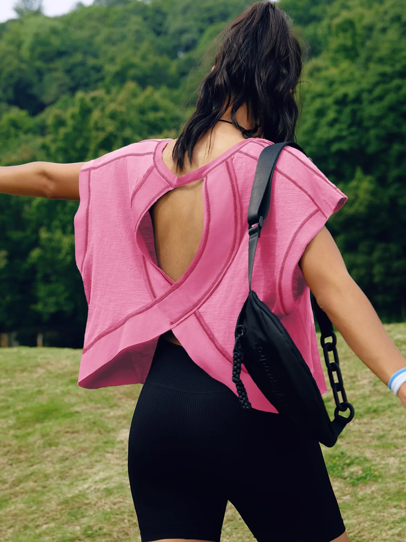 Slight crop, shorter sides, wide neckline, open-cut back and ribbed wrist detail, the open back tops for women is fashionable and sexy, which increases the breathability, effectively dissipates body heat, and keeps cool and comfortable.