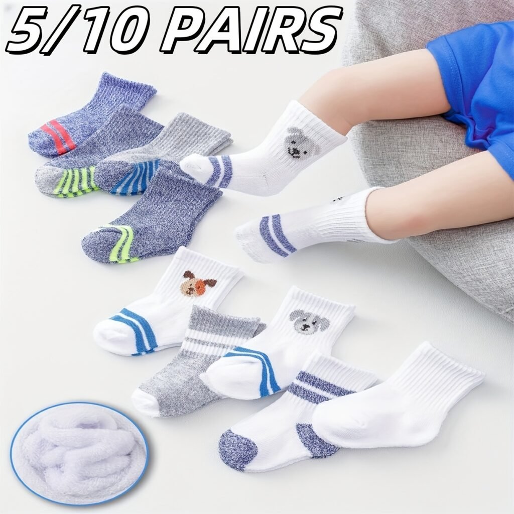 5/10 Pairs Baby Socks Set, Non-Slip Cartoon Dog Stripe Pattern, Cute Mid-Tube Knit Fabric, Polyester 97% Spandex 3%, All-Season, Hand Wash Only